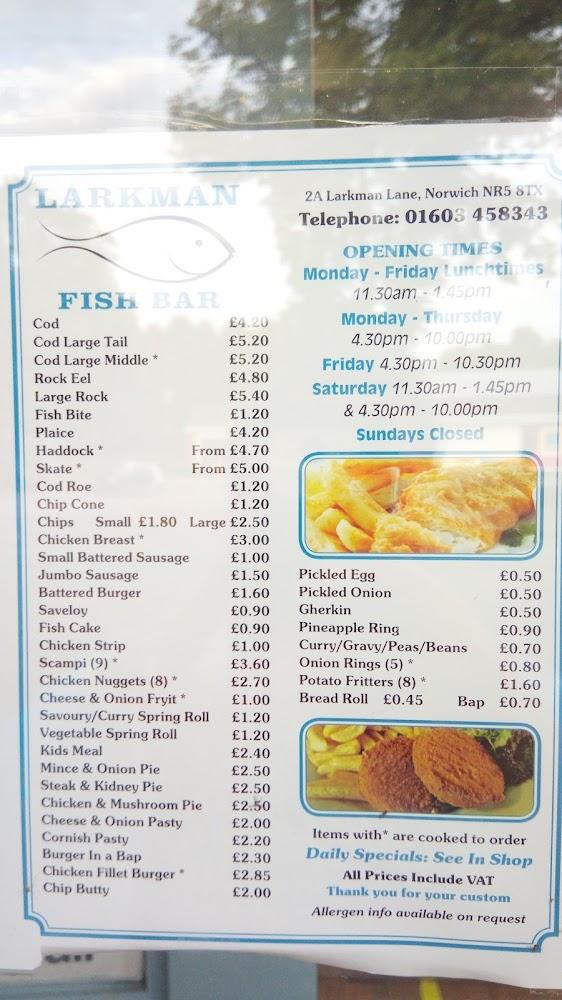 Located at 2a Larkman Ln, Norwich NR5 8TX, Larkman Fish Bar is perfectly positioned for those enjoying a day out or cycling on Marriott's Way. Traffic can be a bit tricky near Aldi, so be prepared if driving, yet street parking and a free lot nearby makes it manageable. The place buzzes with activity, especially during lunch and dinner times, and features a casual vibe that’s perfect for families and solo diners alike.